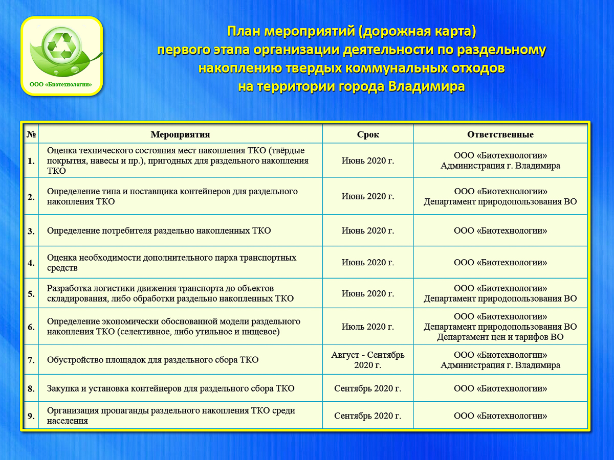 Мусорная эпопея, за которой пристально наблюдают экологически дружелюбные владимирцы, вышла на новый уровень. ООО «Биотехнологии», вопреки нареканиям, приступило к реализации проекта по раздельному сбору мусора. Начал региональный оператор с составления «дорожной карты», то есть пошагового плана, благодаря которому в сентябре многие владимирцы заживут прежней жизнью.