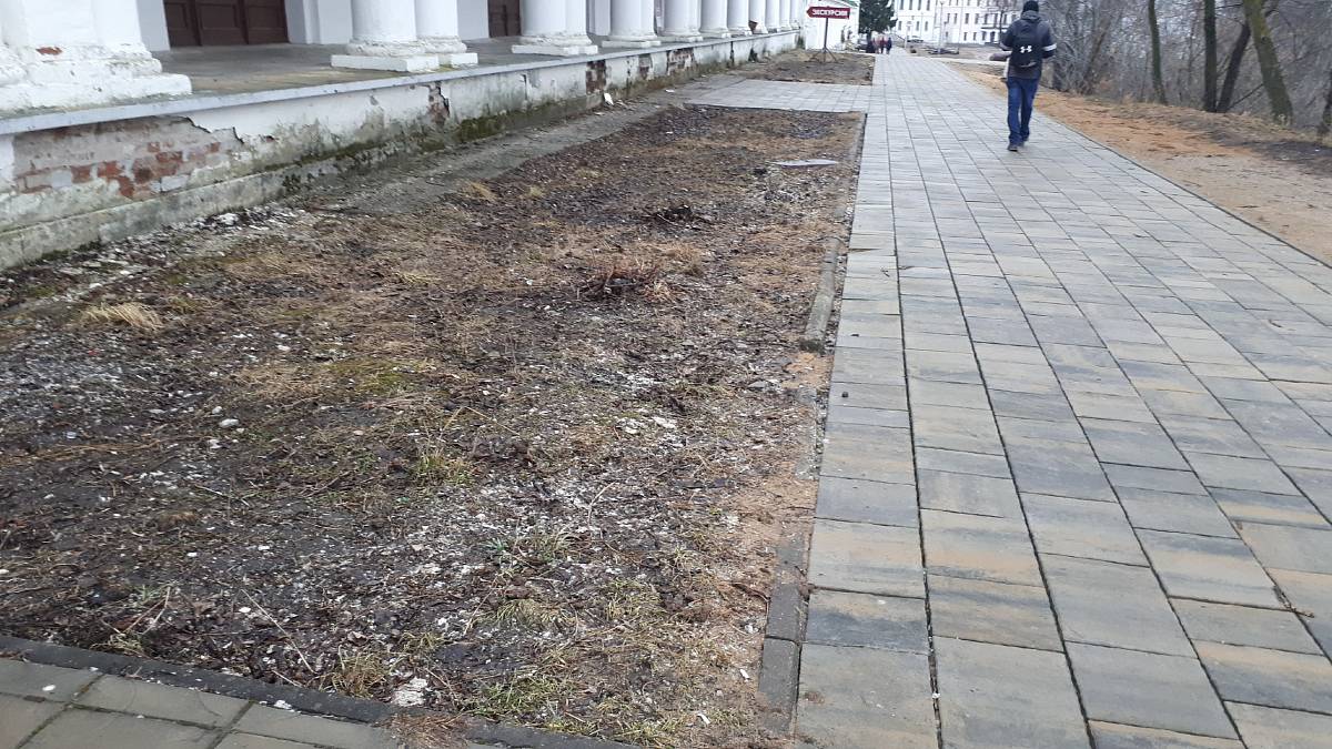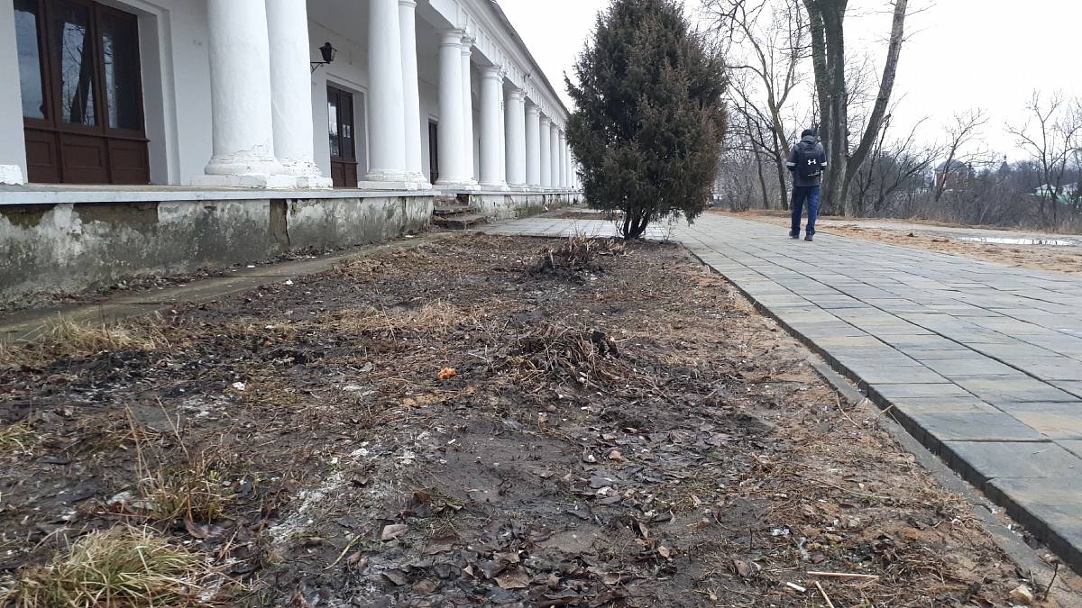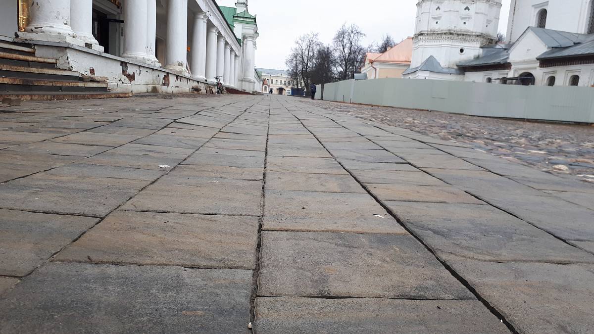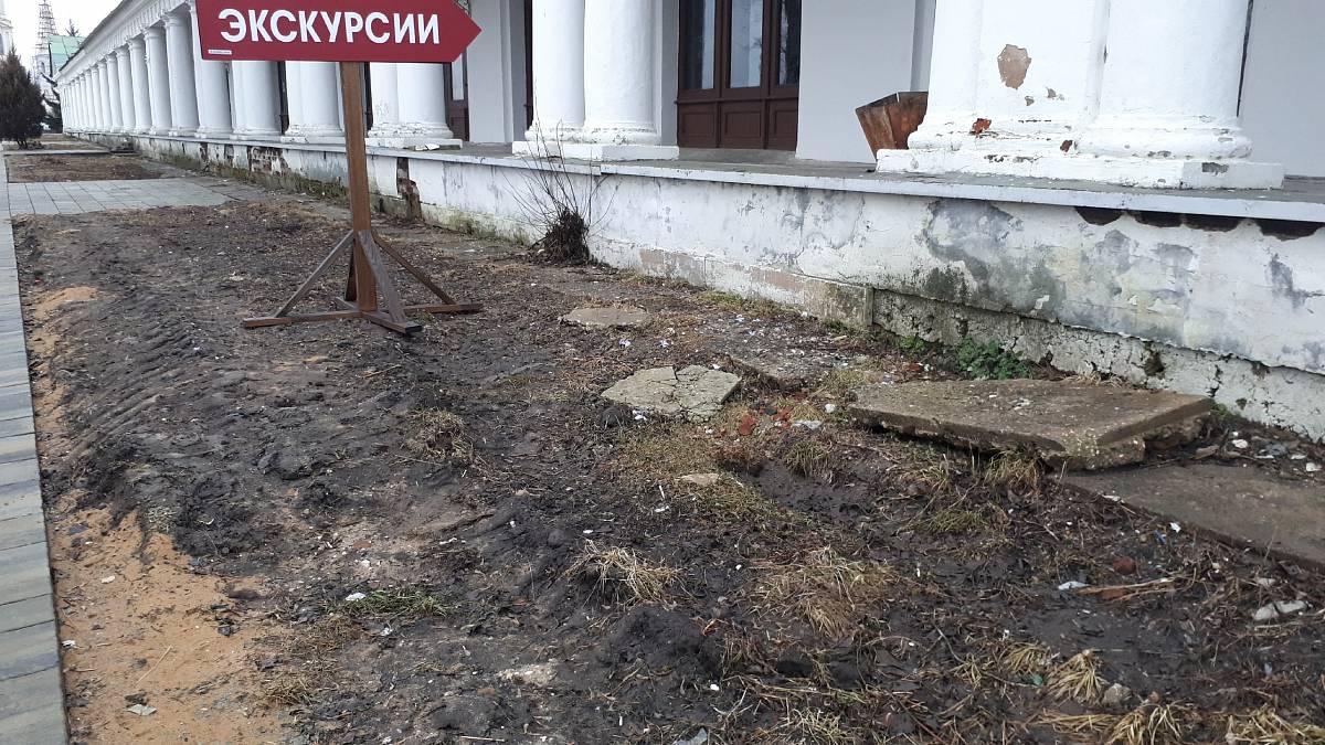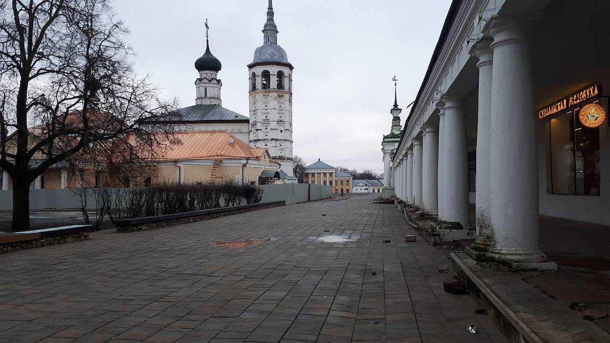 А мы, пока гуляли по центру Суздаля, заметили еще несколько «ноу-хау». Осенью 2019 года горожане переживали из-за тяжелой строительной техники, которая работала в непосредственной близости от Торговых рядов. Они опасались, что фундамент постройки разрушится. И вот результат: колонны, и правда, выглядят гораздо хуже, чем до зимовки.