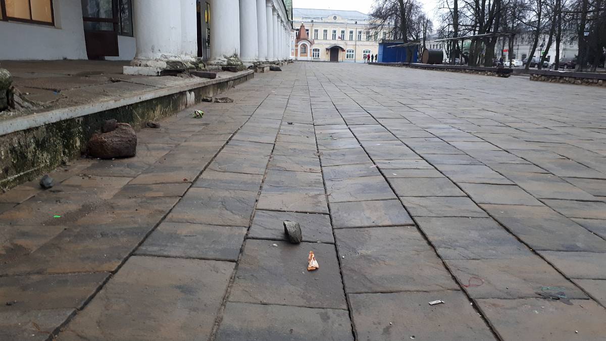 И напоследок о старинной брусчатке Торговой площади. На нее регулярно заезжают автомобили: монтаж шале для рождественской ярмарки, подвоз товаров для сувенирных палаток и т. д. В итоге мы видим лужи, неровности покрытия и вырванные камни.