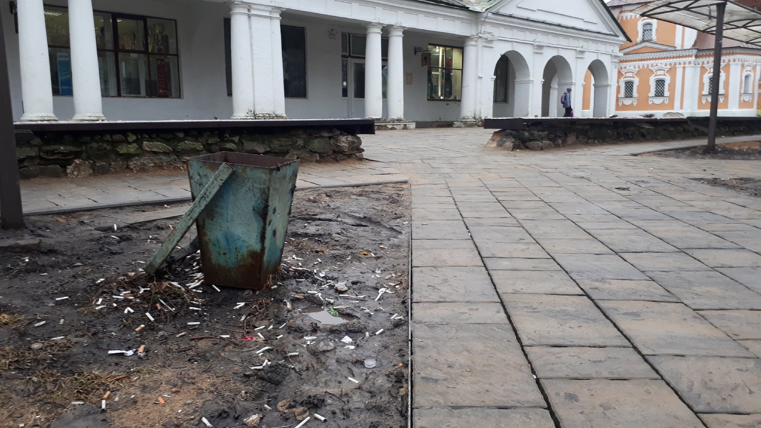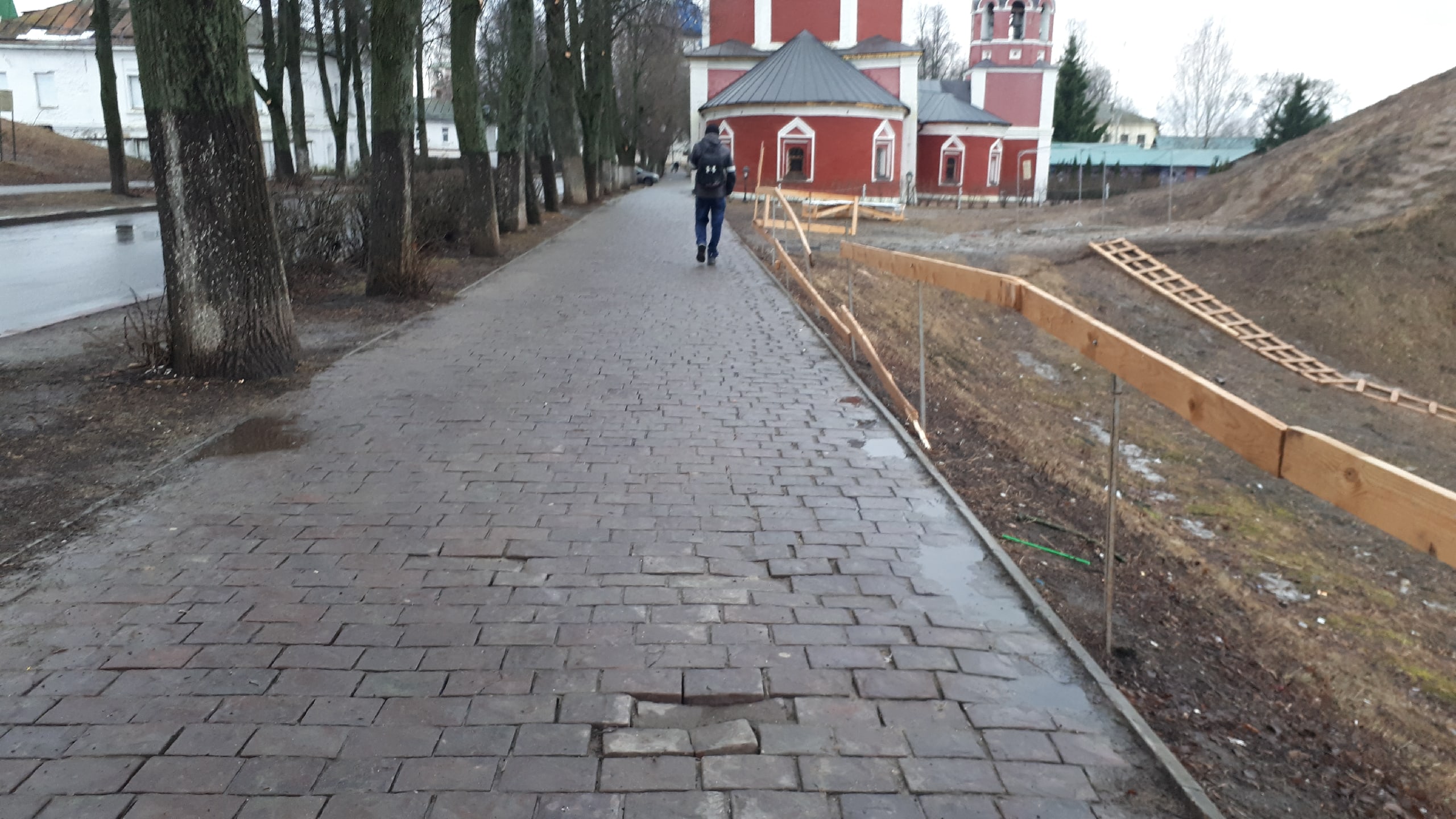 А мы, пока гуляли по центру Суздаля, заметили еще несколько «ноу-хау». Осенью 2019 года горожане переживали из-за тяжелой строительной техники, которая работала в непосредственной близости от Торговых рядов. Они опасались, что фундамент постройки разрушится. И вот результат: колонны, и правда, выглядят гораздо хуже, чем до зимовки.